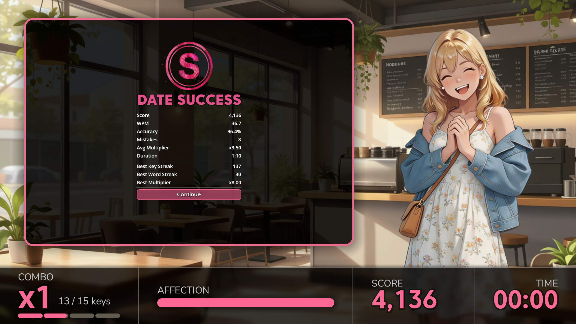 Once the date starts, you'll chat a bit before diving into the real action with fast-paced typing gameplay. Keep your WPM high and your typos low to impress them, win the date, and score a top grade.