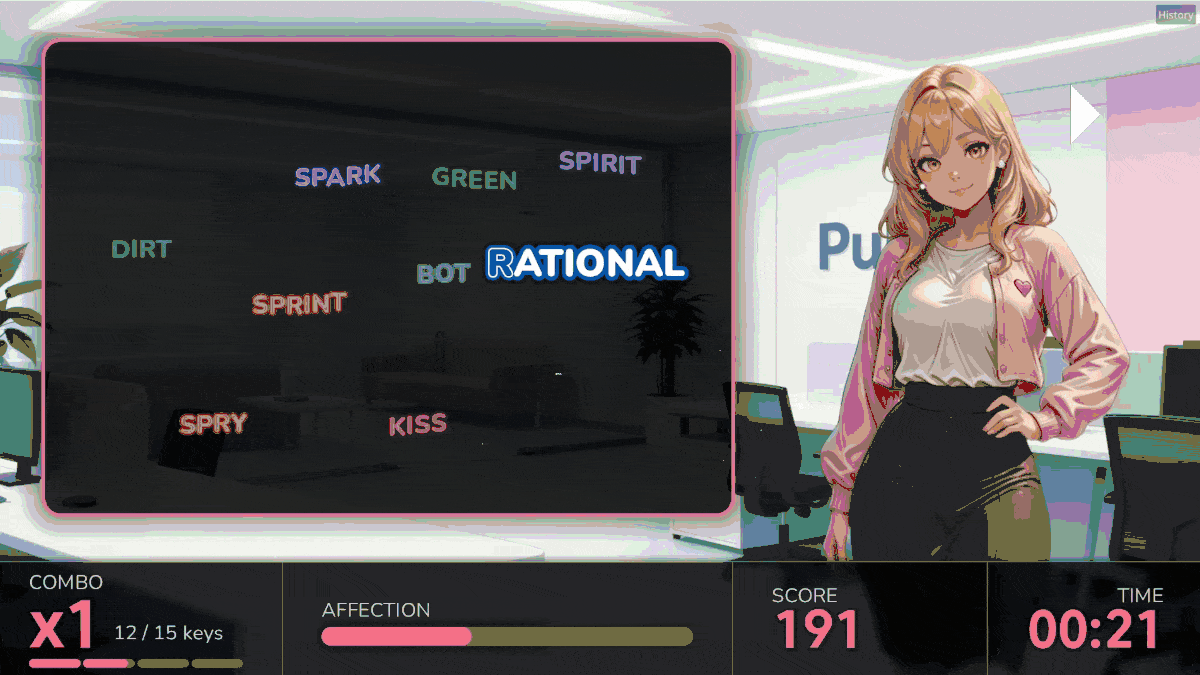 - Advanced Typing Dates: Dates take place on a dynamic board of categorized words. To succeed, you must strategically type words that match her specific interests while actively avoiding her turn-offs. Maintain fast, error-free typing to build streaks and trigger massive combo multipliers for a higher final grade.