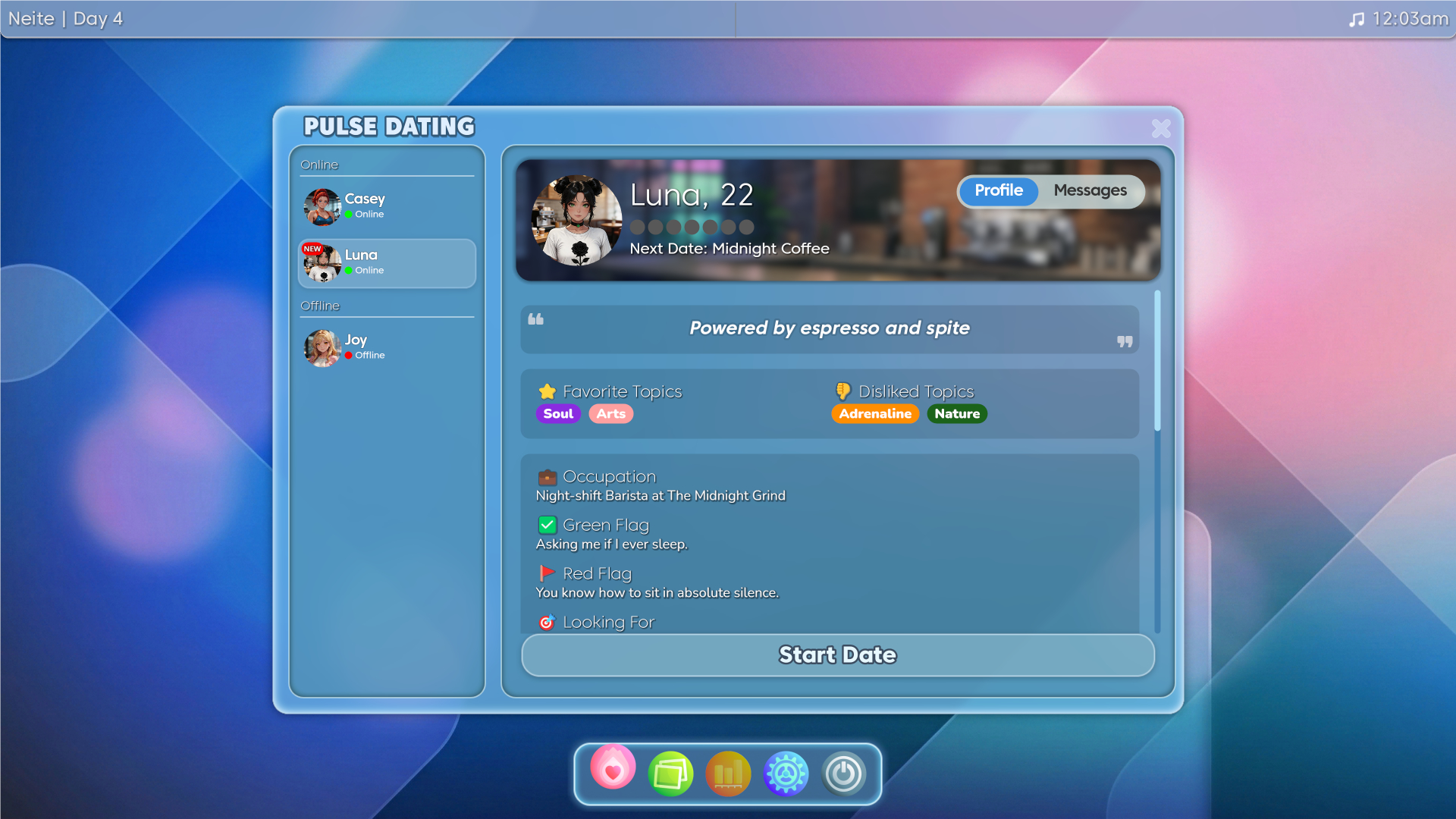 - Luna - The Night-Shift Barista: Powered entirely by dark roast and spite. Can you pierce through the existential dread and actually make her smile?